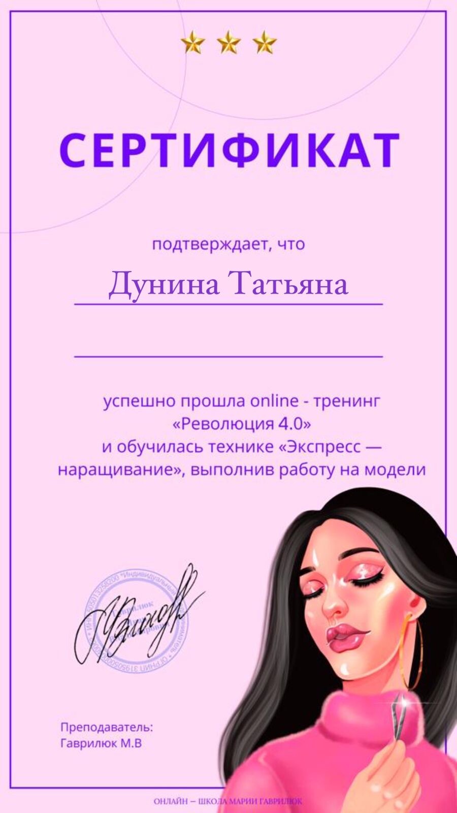 Татьяна прекрасный и опытный мастер! Работа выполнена максимально естественно и аккуратно, учитывая все изначальные пожелания. Результатом очень довольна, с удовольствием вернусь и буду рекомендовать всем знакомым девочкам!! Большое спасибо!